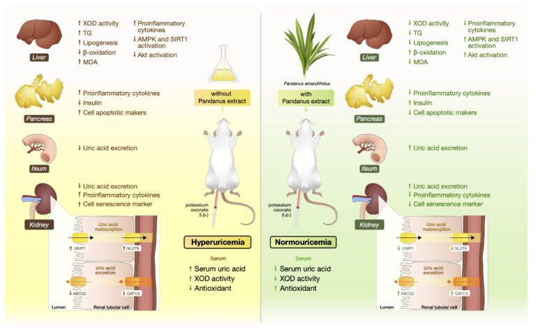 Pandanus amaryllifolius (Pandan) extract serves as a potent, multi-functional therapeutic agent against hyperuricemia, offering a natural alternative to conventional gout medications. By utilizing a rat model where high uric acid was induced by potassium oxonate, the study revealed that the extract effectively lowers serum uric acid through a dual mechanism: it inhibits the xanthine oxidase enzyme responsible for uric acid production while simultaneously acting as a uricosuric agent to promote the excretion of excess urate through the kidneys. Beyond simply managing numbers, the extract provides significant antioxidant protection by neutralizing free radicals and boosting the body’s natural defense enzymes, which prevents the oxidative damage to the liver and kidneys typically caused by high urate levels. Furthermore, its anti-inflammatory properties help suppress the systemic inflammation that triggers painful gout attacks and metabolic complications. Unlike synthetic drugs such as Allopurinol or Benzbromarone, which are often associated with risks of skin rashes, kidney stones, or liver toxicity, the Pandan extract showed a remarkable ability to protect organ function and improve overall metabolic health—including better insulin signaling—without adverse side effects. Consequently, the research concludes that Pandan extract is a comprehensive treatment option that not only treats the symptoms of hyperuricemia but also addresses the underlying oxidative stress and inflammatory damage, making it a promising candidate for natural gout management and renal protection.
